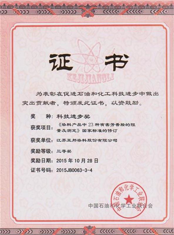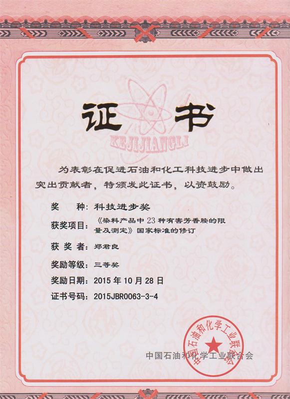 此次大会总结交流“十二五”行业科技创新成就,深入贯彻党的十八届五中全会精神,提出“十三五”行业科技工作的主要思路和任务,对先进集体和个人进行了表彰。304am永利集团染料股份有限公司获得“科技进步奖”单位三等奖,获奖项目为《染料产品中23种有害芳香胺的限量及测定》国家标准的修订,郑君良同志获得“科技进步奖”先进个人三等奖,十届全国人大常委会副委员长顾秀莲为获奖单位和个人进行了现场颁奖。