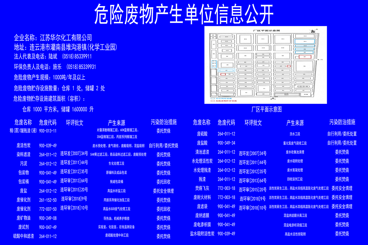 为全面贯彻落实《中华人民共和国固体废物污染环境防治法》,现将江苏华尔化工有限公司危险废物污染环境防治信息公示如下: