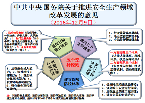 该《意见》从政府企业的安全生产责任落实角度,分别对领导、部门、企业三个层次明确提出党政领导责任、部门监管责任和企业主体责任三种责任的规范落实。要求党政领导做到“党政同责、一岗双责、齐抓共管、失职追责”的第一责任担当;要求部门监管做到“管行业必须管安全、管业务必须管安全、管生产必须管安全”的三个必须规定;要求企业做到党政同担安全责任、一岗具有双重责任、建立组织领导机构、配好安全管理力量、坚持安全报告制度等“五落实”,并做到安全责任到位、安全投入到位、安全培训到位、安全管理到位、应急救援到位等“五到位”的主体责任落实。