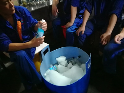 一是给岗位送“清凉”。连云港分公司安全部早在四月份就采购了一批藿香正气水、仁丹等防暑降温药品分发到了生产一线岗位,针对目前高温不退的情况,又补购了药品备用。从7月18日起,每天分上午、下午两次给岗位送冰块,加上配备的轴流风机联合给操作岗位降温。部分车间也及时给工人休息室维修、更换一些老旧的空调,给工人休息时创造一个清凉环境。另外公司每天上午还为生产一线作业人员发放盐汽水,补充员工流失的水分,让广大员工能够第一时间享受“防暑降温”。
