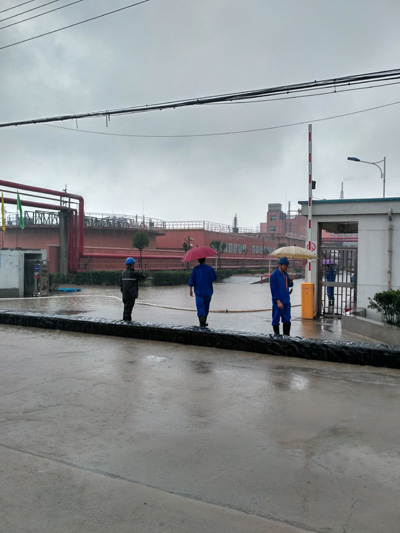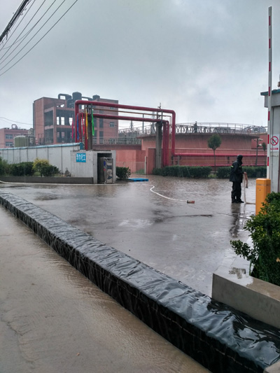 中午12时安全部组织叉车将防洪“神器”——“充水式橡皮坝”卸放至东门及南门处。因为两门地势比厂外道路低,每次降雨路面积水都要流至厂内,不仅增大了公司内部排涝量,而且遇强降雨时势必会造成大量雨水“打循环”,严重影响防汛排涝工作的正常进行,为此公司特意购买了此“神器”予以应对。下午13:15左右大雨如期而至,安全部快速按照预案启动应急方案。只见防汛人员接上“神器”注水阀门,不到10分钟就筑起一堵长24m、宽0.5m、高0.5m的挡水墙,有效阻断了门外水倒流入厂。紧接着公司3处防涝应急泵全部打开进行泄洪。13:30安全部组织生产部、环保部、总务部及相关车间冒着暴雨对厂区内路面、雨水沟、罐区等进行巡查确保排涝正常。14时暴雨转中雨,截止18时左右厂区路面、雨水沟积水全部排除。为了防止夜间暴雨来临,下班后各部门、车间自觉安排人员进行夜间值班保障安全生产。